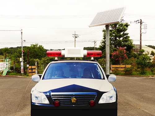 パトカーに似せる事で、ドライバーの速度を抑え、瞬時に緊張させ事故や違反を未然防止するというのが狙いです。弊社では、材質・素材を重視することでイタズラ(缶スプレーの落書き)にも対処できます。設置数は、A・Bタイプにおいて、平成24年7月現在で全国各都道府県250ヶ所近く設置させて頂いております。